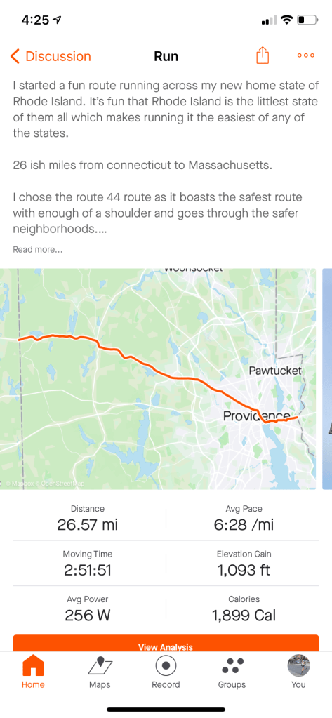 Now being a resident of the Ocean State, it only felt fitting to look into a road route across the state. I started plugging in on Google Maps different points and saw a couple different options. With all of them, you start in Connecticut on the Western-side of the state before making the trek through the wilds of Rhode Island then into Providence and finishing in Massachusetts. What built my route was something others would want to do and one that was the easiest to navigate and the safest while also being a nice “Grand Tour” of the state in a 26 mile capacity. I settled on running on Route 44 the whole way into Downtown Providence and then running out finishing at some car dealerships called “Stateline Nissan” as well as an ice cream shop. The route below shows how the day unfolded and the route: