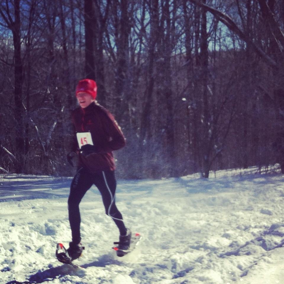 Do not overdress. Most athletes in snowshoe running race in a lightweight longsleeve shirt with a singlet over it, winter beanie, gloves, and tights. You can wear this and be just fine. We warm-up like 10 degrees from the air temperature so try and dress accordingly. Again, any of your winter running outside is a try-out period to get your snowshoe outfit dialed in.
