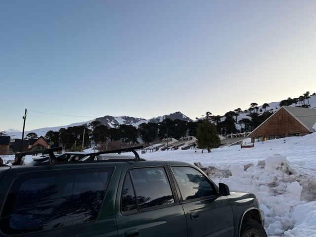 Bus rides are pretty uneventful. We did stop at a rest stop where I hat some baked ham flavored Lays that were okay. My breath in the aftermath…well that is another story for another day. In terms of what we saw on the bus ride. We would go through these towns that had fossils of dinosaurs then followed by scrub and desert plains. We saw some horses out there and that was the extent. Things did not get spicy until just 18 kilometers from Caviahue. We had smelled like burning rubber for an hour now and then we had to stop. The bus transmission was in distress. With bad cell reception and being in-between a mountain pass, we waited for another bus and took the time to walk around outside in the cold and take photos. When the new bus arrived, we loaded on like sardines as the windows fogged-up and our rate of speed that last 18k was at a snail’s pace. We ended joining a standard transport bus which we packed in past capacity and man did we all not want to jinx ourselves. We finally made it to the lodges to a winter wonderland of snow. It was a little tough to figure out which cabana we were staying at but once we figured it out, our cabin of 7 was able to settle in. A dinner of Kalfu was nice as in the small village of Caviahue, where the race would be held, finding food would be a challenge for the remainder of the trip.