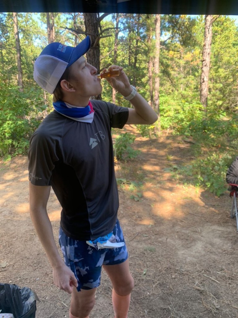 My Ucan Energy and Edge gels were working great for me along with Long Haul Hydration and bananas at each aid station along with other whole foods. Man Dad came to crew and join me around Noon and I got into a nice groove trying to bank time in the day light. I was probably running too fast as I split the 50 mile mark around 7 hours and 30 minutes and continued that pace up through 70 miles. I was able to run 7 loops before it started to become dark and the woods started my need for a headlamp in my 8th. The pace I was going if I could maintain it, I could possibly finish 157 miles in 24 hours which would give me an unofficial performance for the US 24 hour team (as the course needs to be USATF certified and this one wasn’t) . I was flying and loving the course.