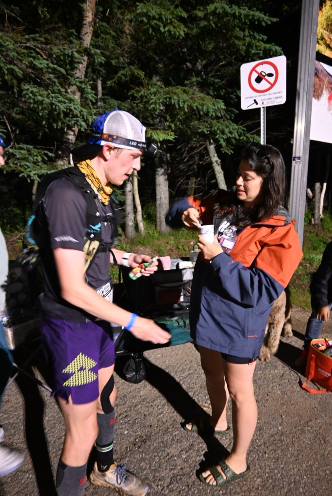 I was now around 10-12th place as I leap-frogged with runners throughout the aid stations. I ran with a local through the bogs of Massif, then onto Cap De Salut. I connected with two other runners who would pass me on the descents and I would gain a lot of time on the flats and uphills. I continued to drink and eat like a champ as my stomach was solid the whole race. Untapped maple raspberry in my bottles made a huge difference in fighting through the high humidity of Quebec. After Cap De Gribane, we were in the part where I was getting closer to daylight and the halfway mark where I would see my crew again at Saint Tite De Caps, a Church before you run the super technical Mestashibo trail. I was already just trying to survive to that aid station. As the sun started to rise, I hit the rock garden ascent to the next aid station called Montee Du Lac. This was Catskill mountain running going through big car-sized boulders through a stream and soul-sucking mud. I laughed at myself, what did I get into here? As I worked my way uphill, a major accident happened. Boom! I slammed forward. My mouth met rock and I bounced back-up in pain. I did a search and moved my tongue around my teeth and luckily my teeth did not get cracked though I thought they did. My lips started to burn with pain and soon blood came flowing out of my lip as the sharp boulder punctured through my lip into the inside. I was still a good 5k from the aid and another 7k to seeing my crew. I called Ashlee on my cell phone and began my call to inform her of what happened but also how much I was suffering out here. This was not a trail race. Was I running the Canadian version of Barkley? I pushed more up the slopes eventually reaching the aid station. There were two medics there that assessed and helped me out. I was pale in complexion. I needed food. They sat me down and then worked on disinfecting my wound as well as feeding me coffee, Xact fruit bars, potatoes and so much more. I have to say, the aid stations, the medical staff were absolutely top notch. I was really impressed with how they organized this on this point to point race. The medics used bandages to soak-up my blood as the wound was starting to close. I would need to be evaluated at the next aid station as that was where they weigh you and have full-support with crew access and all. After about 30 minutes in the aid, I headed back out. My soft flasks had coffee in them as morning had just broke and the caffeine gave me an extra boost as I pushed through the technical terrain, the best I had felt to the aid station. I flew through this section now feeling better that I could see the trail in the daylight. I passed a few runners and then eventually hit the pavement section to the aid station. I was running 7:40-8:10 minute pace on this mile long road section. The course diverts you into a tunnel that this year was filled up to my waist in cold water, where it was just up to your ankles most years. I slowly moved through there as I heard Kelsey yell to me saying I was almost at the aid and to hurry up. I was short with her and said, ” I am going as fast as I can! I don’t want to slip on another rock and bust my lip open again. I am goin to take my time.”