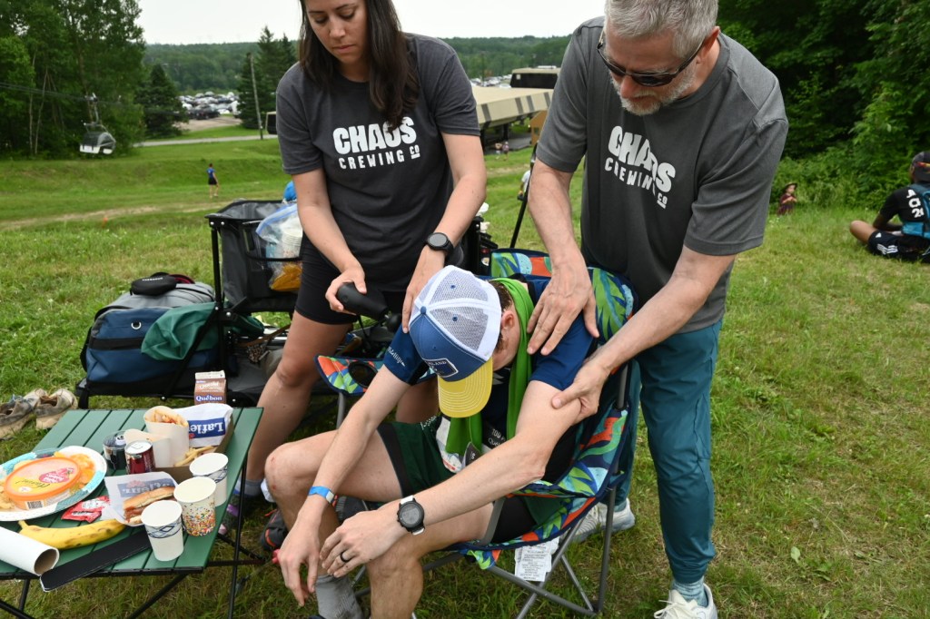 I entered the aid station and took some time to re-group here. Julien, a top Canadian snowshoer and friend, would be pacing me through this section and I was so grateful for his support. My body felt shot. We used the Theragun on me, I tried to eat some French fries and mostly ate chocolate milk, bananas, and hummus. After a 12 minute stop, Julien and myself started-off in the hunt. We hit the technical uphill mountain climb as I pushed hard up the 2,500 foot climb. The trails were muddy and slick so it made it a challenge to push hard up them. I did the best I could grunting in discomfort. Julien did an amazing job just encouraging me and having me keep on pushing. After 40 minutes, we hit the summit lodge and the next aid station. I took about 5 minutes here to refuel and as we started the descent down the mountain, I had to stop for a bathroom break. After that break, I grunted my way down the mountain. My legs were beat-up pretty good so while I was hoping I would be flying down the mountain, 9 minute miles was about as fast as I could go. You see, with my weakened right ankle, I was nervous I could really injure myself if I pushed too hard. `We descended half-way down the mountain before hitting the second climb back-up to the summit lodge. It was another gust-busting climb. I grunted as I pushed my ailing body up the steep, technical trail until hitting the same mountain top aid station again. I took some time to refuel again and then off on another section of the trail we went.